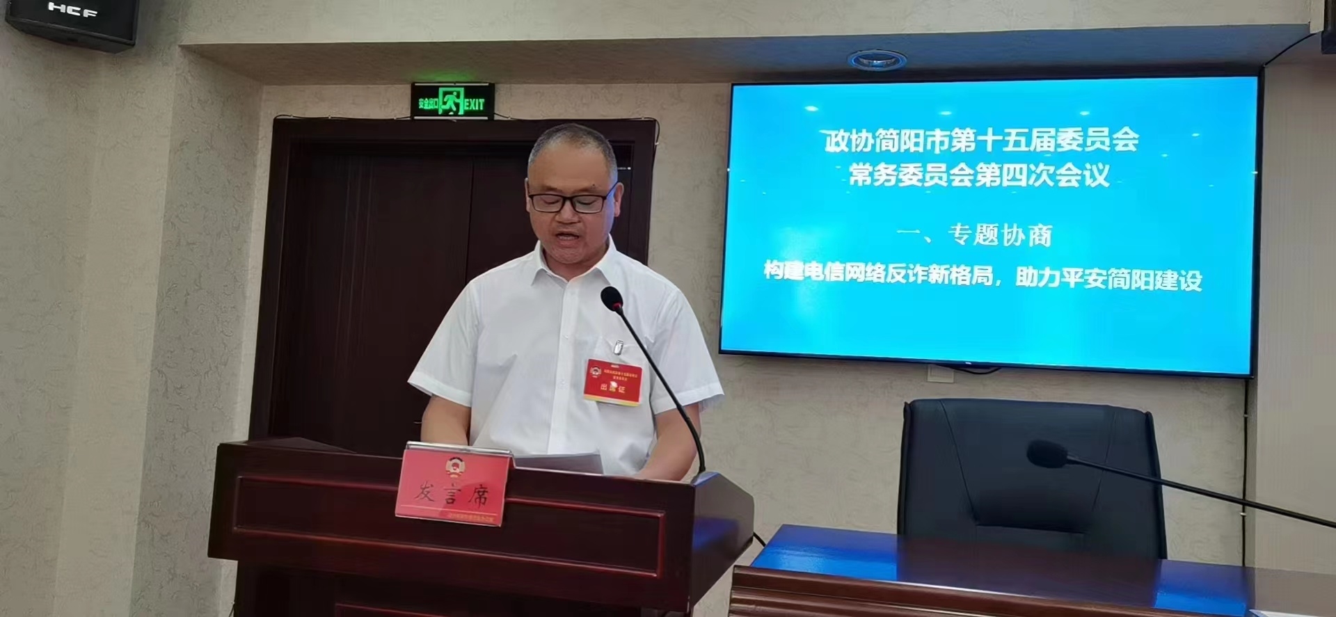 会议传达学习了习近平总书记来川视察重要指示精神、省第十二次党代会精神和施小琳同志莅简调研指示精神,协商通过有关人事事项。会上,市政协专题调研组部分政协委员和企业家代表作了发言。其中,九三学社社员、市政协常委陈平向会议提交的《关于加强电信网络诈骗防范的建议》作口头发言。该发言材料从强化理念,站高谋远,提升治理电信网络新型犯罪的政治定力;重点治乱,打财断血,提升打击电信网络新型犯罪的执行力;同频共振,协作攻坚,提升打击电信网络新型犯罪的综合防治力三个方面提出建议。