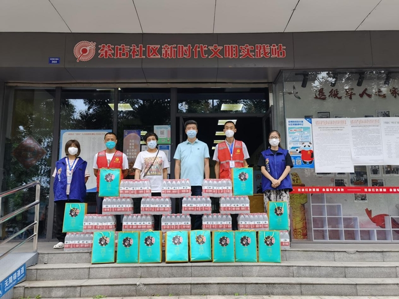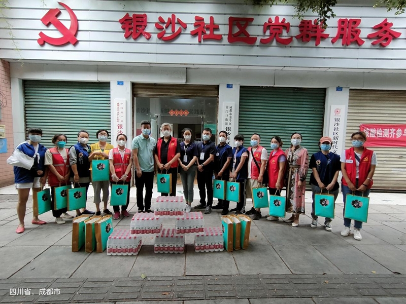 9月7日,总支主委谢丹带领陶旻、吴礼鹏、赵斌、任秀利、杜宇彬等会员,为对口联系的营门口街道花照壁、银沙、银桂、长庆、茶店5个社区送去了250件矿泉水、97盒月饼,表达了对社区一线工作者的敬意,感谢他们为守护社会平安健康所做出的贡献,并祝他们和家人中秋快乐。一件件矿泉水、一盒盒月饼,就是一份份爱心礼包,体现了民建金牛区总支以实际行动践行社会责任的担当,也彰显了民建人的热心和大爱。社区工作人员对民建金牛区总支热心相助表示感谢,并表示他们将把这份关爱支持转化为全力抗疫的动力,以更加饱满的热情、昂扬的斗志和务实的作风,投入到疫情防控的战斗中,全力守护辖区居民的生命安全和身体健康。