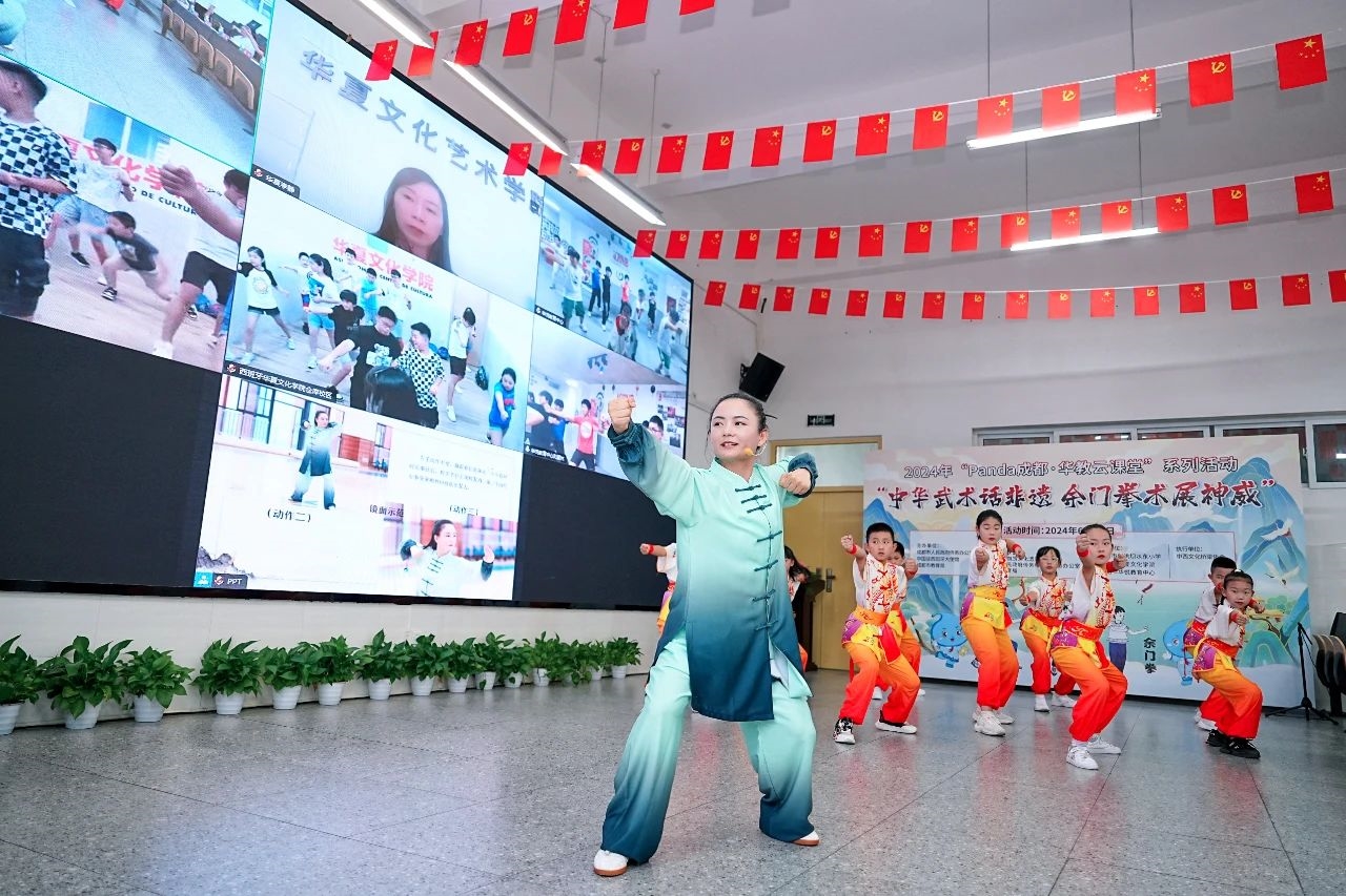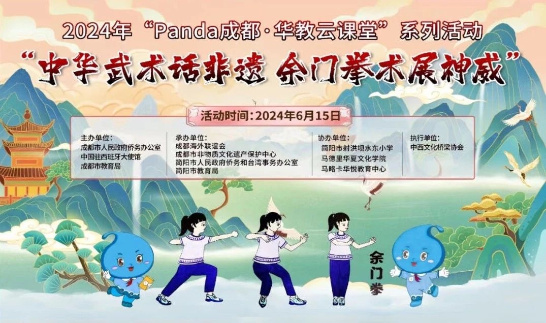 为弘扬中华优秀传统文化,6月15日,由成都市人民政府侨务办公室、中国驻西班牙大使馆、成都市教育局主办,成都海外联谊会、成都市非物质文化遗产保护中心、简阳市人民政府侨务和台湾事务办公室、简阳市教育局承办,简阳市射洪坝水东小学、西班牙马德里华夏文化学院、西班牙马略卡华悦教育中心协办,中西文化桥梁协会执行的2024年“Panda成都·华教云课堂”系列活动“中华武术话非遗 余门拳术展神威”在简阳市射洪坝水东小学举行。
