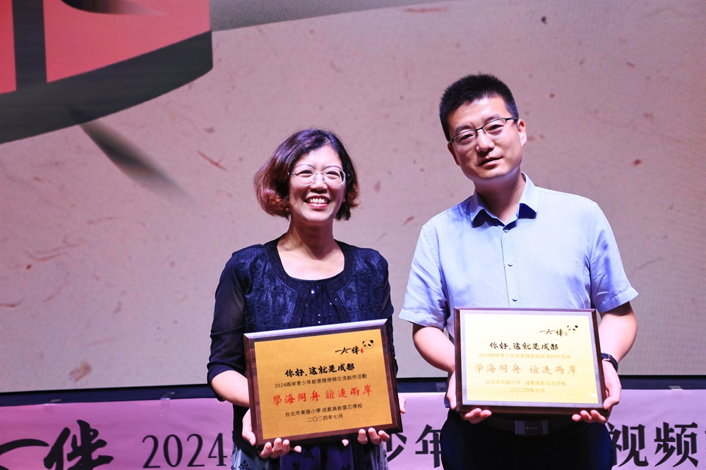 在首映颁奖礼现场,最佳摄影奖、最佳导演奖、最佳表演奖以及最佳影片奖逐一公布。“学海同舟,谊连两岸”,一个个视频创作,不仅是大家辛勤付出的成果展现,更是对两岸校园文化交流与合作的最好见证。台北市东园小学校长陈毓卿和成都高新云芯学校党支部书记、校长马飞山分别分享了此次成都研学拍摄之旅的感受。随后,两位校长互换友谊学校牌匾,见证校园文化交流和校园友谊长存。
