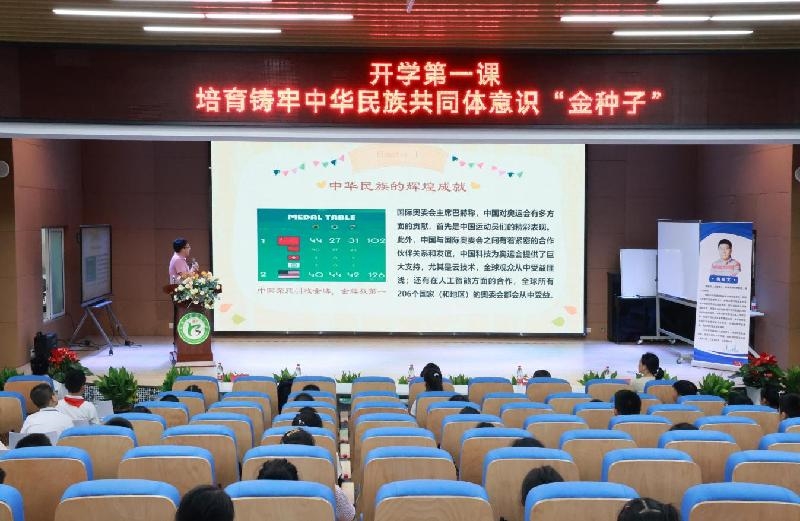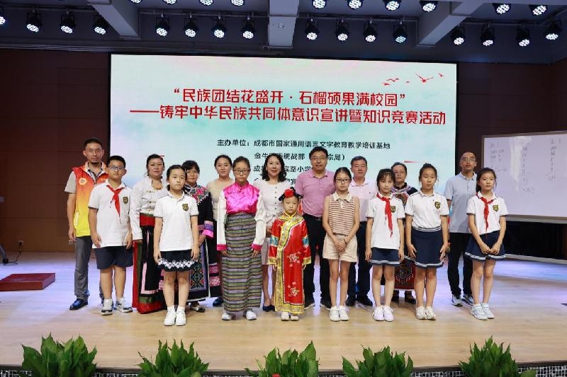 九月是四川省民族团结进步宣传月,为引导学生牢固树立正确的历史观、民族观、国家观、文化观,增强“五个认同”,增进学生对中华民族多元一体文化的认识和理解,9月9日,金牛区在迎宾路小学校开展“民族团结花盛开·石榴硕果满校园”铸牢中华民族共同体意识宣讲暨知识竞赛活动。本次活动由成都市国家通用语言文字教育教学培训基地、金牛区委统战部(区民宗局)主办,成都市迎宾路小学校、金泉街道迎宾路社区和郎家社区共同承办,学校近200名师生参与活动。