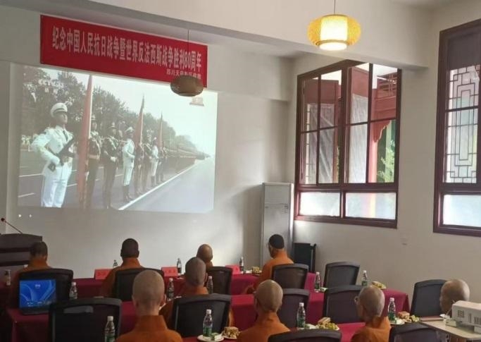 9月3日上午,纪念中国人民抗日战争暨世界反法西斯战争胜利80周年大会在北京天安门广场隆重举行。为加强思想政治引领,激发广大佛教界的爱国热情,四川天府新区佛教界组织了集中观看阅兵式直播活动。