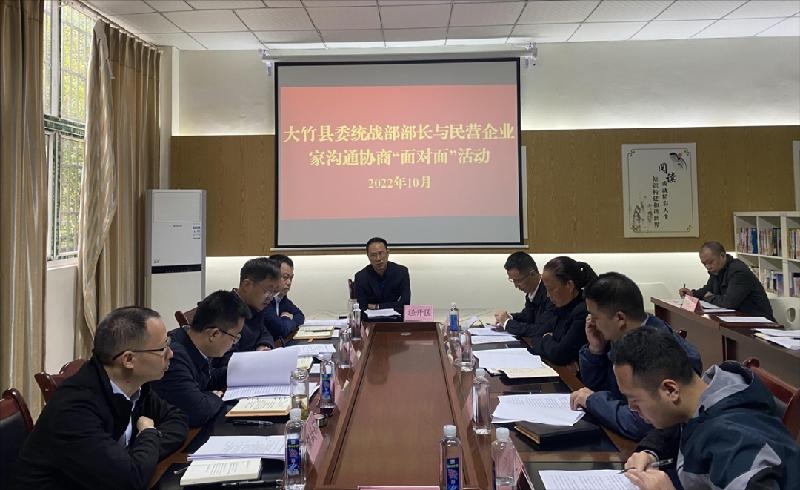 近日,大竹县委统战部开展民营企业家沟通协商“面对面”活动。四川敏辰科技有限公司、大竹众联机电工业发展有限公司等四家民营企业代表与县级相关部门沟通企业发展痛点、难点、堵点问题,寻求有效解决方案,通过面对面交流,实打实为企排忧解难。大竹县委常委、统战部部长、总工会主席庞启来,大竹县副县长刘高超,大竹县经开区党工委书记舒中华出席活动。