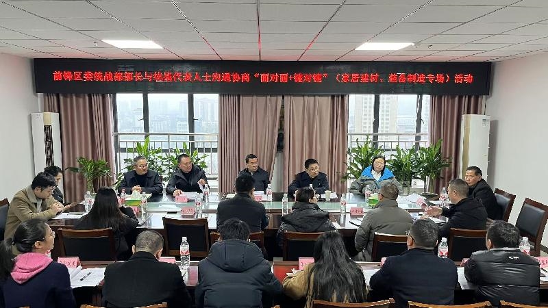 12月5日下午,前锋区委统战部部长与统战代表人士沟通协商“面对面+键对键”活动(家居建材、装备制造企业专场)举行。区委常委、统战部部长张建春主持会议并讲话。