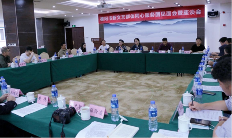 9月16日下午,德阳市新文艺群体同心服务团见面会暨座谈会在明悦尚景酒店三楼会议室举行,市新联会自由职业人员(新文艺群体)分会会员,德阳市新文艺群体代表23人参加座谈。会议由新文艺群体同心服务团团长陈明主持,市委统战部副部长杨兆红、市新联会会长代晓东、自由职业人员(新文艺群体)分会会长卿建彬出席会议。