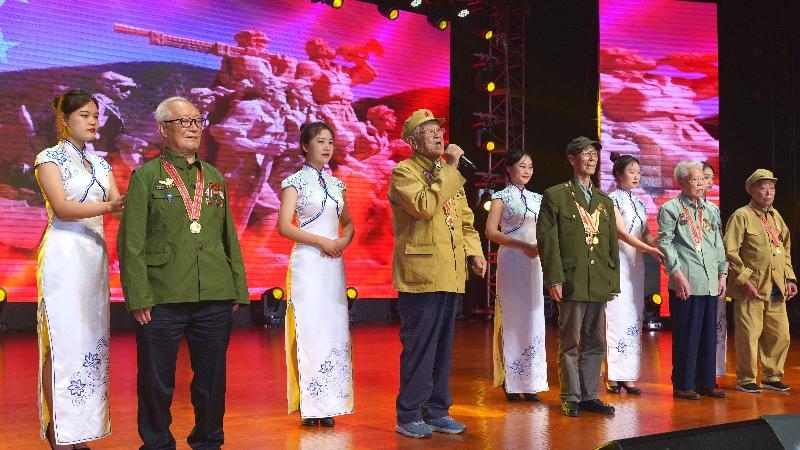 当天,演出现场邀请了五位抗日战争、抗美援朝老兵讲述自己亲历的战争故事,回顾共产党百年征程,并为他们送上祝福的献花。