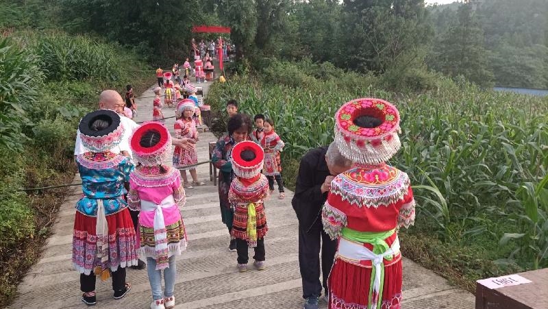 7月12日,分水镇木格倒村举行庆祝中国共产党成立100周年“2021,再唱山歌给党听”主题活动。通往活动现场的路上设置了十个“关卡”,从醪糟酒到啤酒、从啤酒到红酒……酒味越来越浓,寓意着中国共产党的发展越来越好,少数民族同胞身穿各式各样的民族服饰,热情接待来宾。