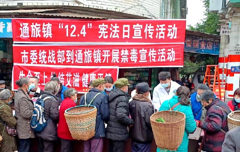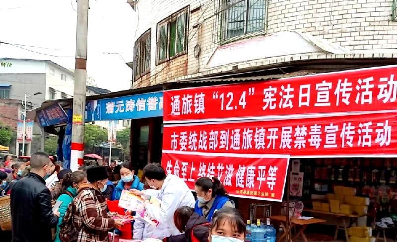 12月3日,资阳市委统战部会同乐至县通旅镇禁毒办、镇司法所、镇卫生院等单位结合“12.4”宪法宣传日开展禁毒宣传活动。