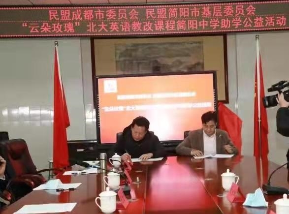 2022年1月7日,民盟成都市委员会、民盟简阳市基层委员会携手“云朵玫瑰”北大英语教改课程助学公益活动走进简阳中学。“云朵玫瑰”华玫科技集团作为民盟盟员单位,此次向简阳中学捐赠市场价值约77万元的北大英语《单词突击赢》公益课程,该课程由“云朵玫瑰”华玫科技集团联合北大未名集团共同开发,将为简阳中学的学生提供更优质的英语学习服务。华玫科技集团和简阳中学签订了捐赠协议,并举行了“北大英语创新教学实验基地”揭牌仪式。