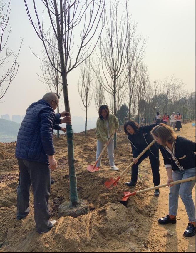 在植树现场,大家干劲十足,搬树入穴、扶正苗木、挥动铁锹、提水浇灌,经过大家默契的配合,种下的一颗颗“红杉木”迎风挺立,不仅错落有致,也萌发出一片初生的希望,而希望正在萌芽。