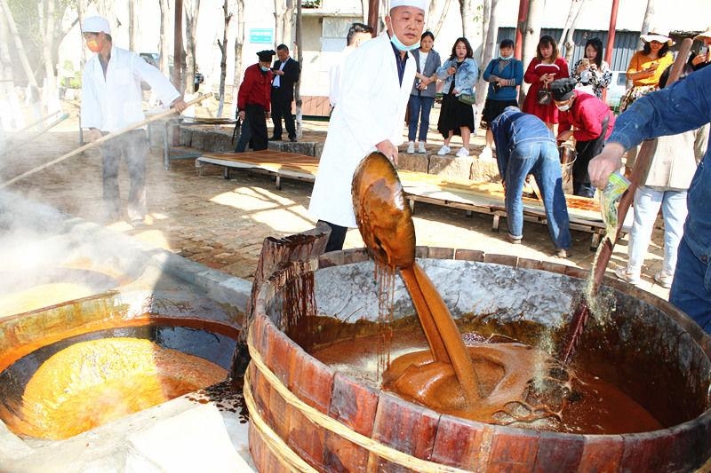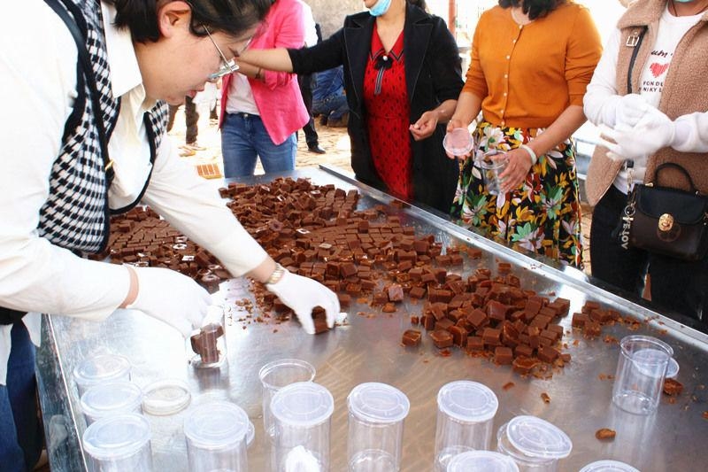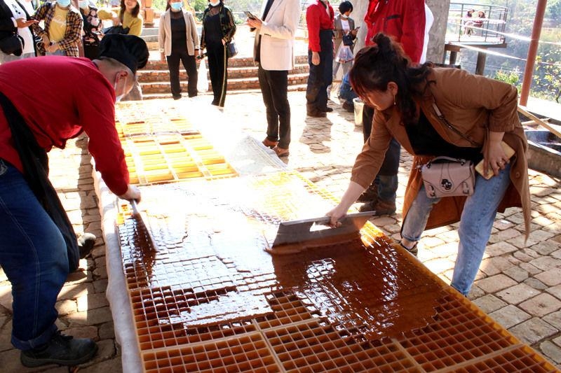 终于到了起锅时刻,金黄色的糖浆被舀进木质大盆,工人师傅用木锤使劲地来回搅动,糖浆慢慢变凉,并更加变稠,工人师傅快速地将变稠的糖浆倒在事先准备好的模具中,不一会儿工夫,慢慢冷却的糖浆变成了固体小方块红糖。大家争相品尝,并用瓶子把制好的小方块红糖装起来带回家,让远方的家人、朋友品尝自己亲自参与制作的米易红糖,也给她们留下长久甜蜜的回忆。
