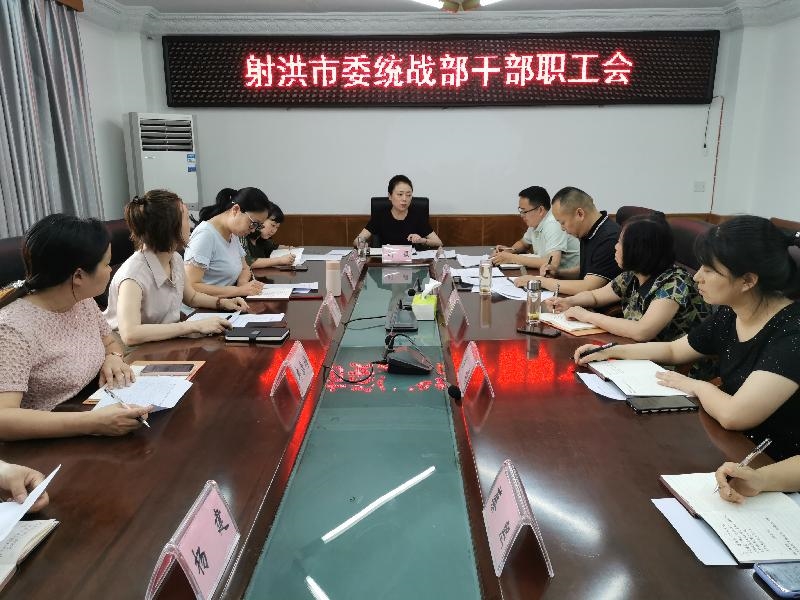 6月9日,射洪市委统战部召开干部职工会,市委常委、统战部部长刘颖主持会议,市委统战部、市工商联、市民宗局相关负责人及全体干部职工参加会议。