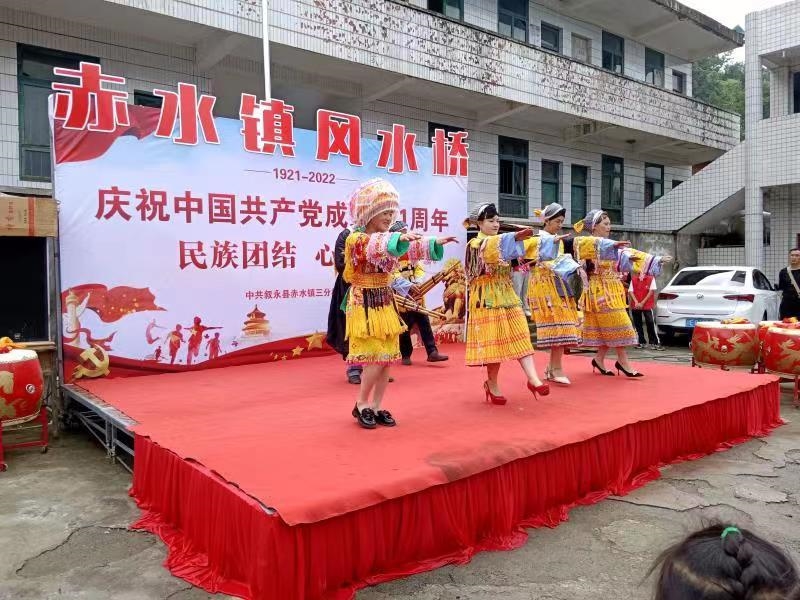 活动现场,三分村在家党员、少数民族群众、小学生等组成表演团队,通过表演红歌合唱、苗族芦笙舞等节目庆祝党的生日。