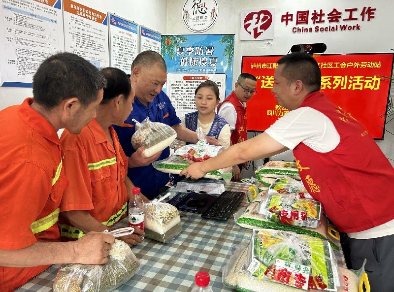 活动中,致公党江阳区基层委、四川力攀消防工程有限责任公司的志愿者为现场的劳动者送上防暑降温药品包、大米、冰糖、绿豆等防暑降温用品,并提醒大家可以经常到服务站纳凉休息,在工作期间要合理安排作息时间,注意身体、预防中暑。