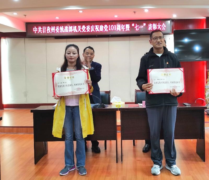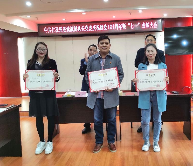 会议在雄壮的国歌声中拉开帷幕,与会人员全体起立,齐唱《义勇军进行曲》。会上,州藏学研究所所长刘康飞宣读了《中共甘孜州委统战部机关党委关于表彰优秀共产党员、优秀党务工作者的决定》,9名优秀共产党员、4名优秀党务工作者受到表彰。随后,获得表彰的党员代表依次上台领奖,优秀党务工作者代表罗绒扎西、优秀共产党员代表阿斯加、张燕燕依次作交流发言。