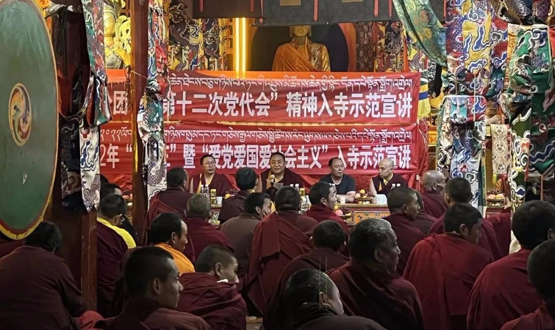 为坚持藏传佛教中国化方向,积极引导寺庙僧尼增强“国家意识、公民意识、法制意识”,引导广大僧尼自觉做遵纪守法、遵规持戒的合格僧尼。近日,甘孜州佛教协会第三宣讲团赴白玉县举办省第十二次党代会精神暨“五二三”“爱党爱国爱社会主义”主题教育集中宣讲活动。甘孜州佛协机关党组书记、秘书长高尔布带领宣讲团成员一行,分别到白玉县打莫寺,邦忠寺、酿托寺开展主题宣讲活动,共180余名僧尼参加。