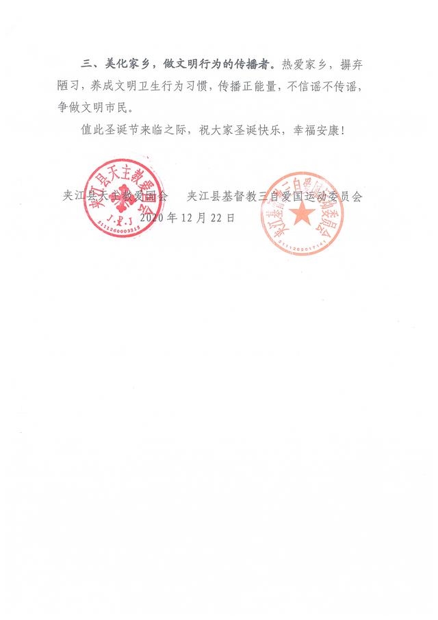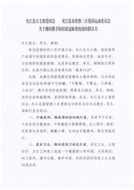 12月22日,夹江县天主教爱国会、夹江县基督教三自爱国运动委员会联合发布《关于继续携手防控新冠肺炎疫情的倡议书》。两大爱国宗教团体号召广大信众不凑热闹,做疫情防控的践行者;爱护卫生,做巩固国卫的先行者;美化家乡,做文明行为的传播者,继续携手共同防控新冠肺炎疫情。