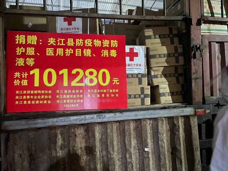 夹江县陶瓷、纸业、茶业、建筑业、餐饮业、木材加工业、青年企业家协会和家居建材商会捐赠医用防护服、医用护目镜、消毒液等防疫物资共计10余万元。