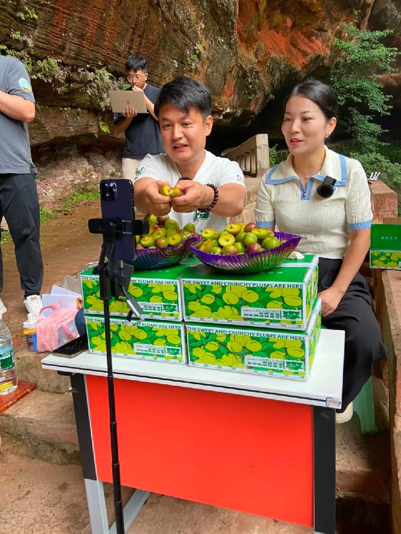 品尝李子、展示果品,回应粉丝关切.......沐川竹海箫洞飞虹景点,凉风习习,经过精心筹划,网络主播们使出浑身解数,推广销售沐川李。来自阿坝州汶川县的“西羌姐妹”身着民族服饰,在直播团队中格外显眼。