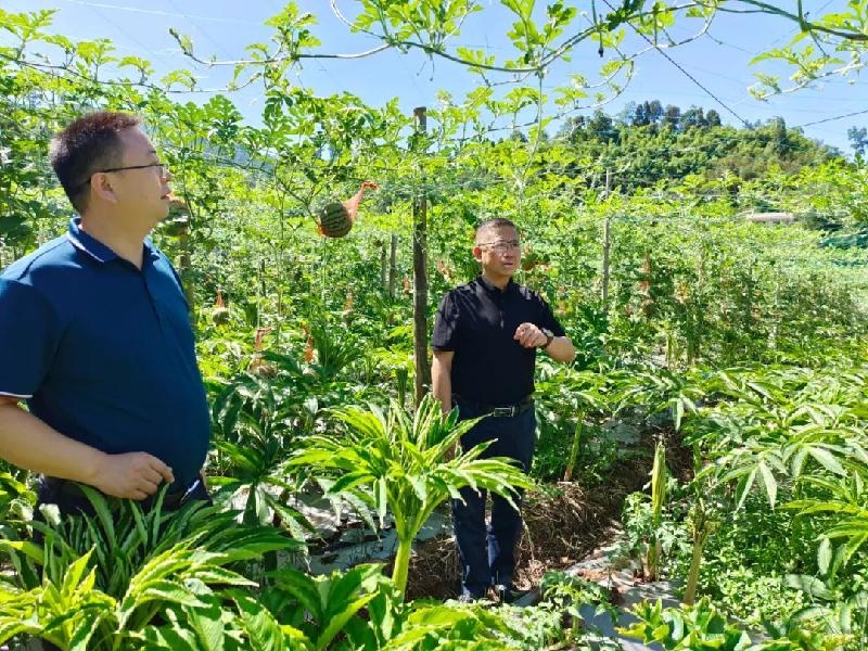 在底堡乡龙坨村魔芋粮经复合园区,地里的魔芋郁郁葱葱,套种的丝瓜、西瓜挂满棚架,放眼望去硕果累累,长势喜人。余斌走进园区边走边看,了解到套种的丝瓜、西瓜不仅能为魔芋遮阳,每亩还能收入4至5千元时,对立体式的套种模式给予充分肯定。他表示,要认真总结推广魔芋“林下种植、粮经复合”等模式,积极引入民营企业、乡贤个体经济,促进魔芋产业综合效益进一步提高,推动魔芋基地高质量发展,打造魔芋产教研学新地标。