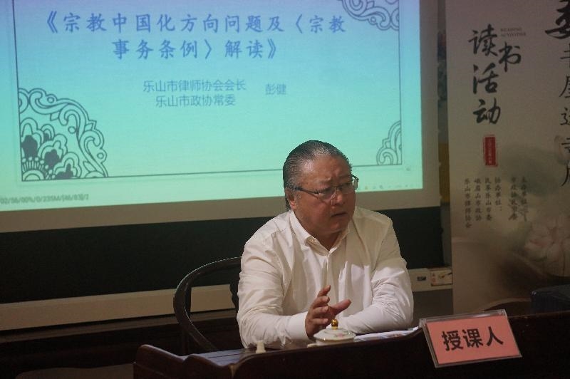 乐山市律师协会会长、民革乐山市委会“同心·法律服务团”团长彭健,通过座谈的形式,围绕《宗教中国化方向问题及<宗教事务条例> 解读》分享,从新时代宗教工作的新思想、新理念、新战略,《宗教事务条例》主要内容,涉及法律责任三个方面进行了宣讲,结合真实案例、以案释法,讲述了宗教财务监督管理、宗教活动场所法人资格等相关知识,通过生动的讲解,让枯燥繁化的法律知识形象化、生动化、易懂化,让参加人员都认识到学法用法的重要性,进一步提升学法、懂法、守法、用法的意识。释心定表示,通过此次宣传学习活动了解了很多法律知识,强化了自己的法治观念,今后将依法开展宗教事务活动。