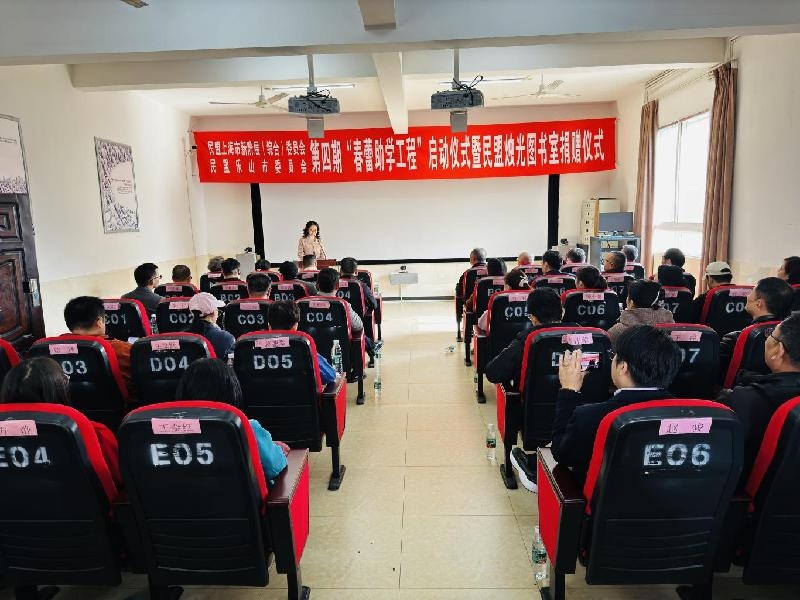 11月29日,民盟上海市新阶层(综合)委员会、民盟乐山市委员会在峨眉文旅综合高中举行第四期“春蕾助学工程”启动仪式暨民盟烛光图书室捐赠仪式,活动由乐山市政协副主席、民盟乐山市委会主委刘淑玉主持。中共乐山市委统战部副部长易海波出席活动并讲话,民盟上海市委原组织部副部长陈佼,民盟上海市新阶层(综合)委员会秘书长曹斌,民盟乐山市委会副主委袁洪、张健、何兵,峨眉文旅综合高中校长副校长曾小龙等出席。爱心盟员代表、受助学生代表共50余人参加活动。