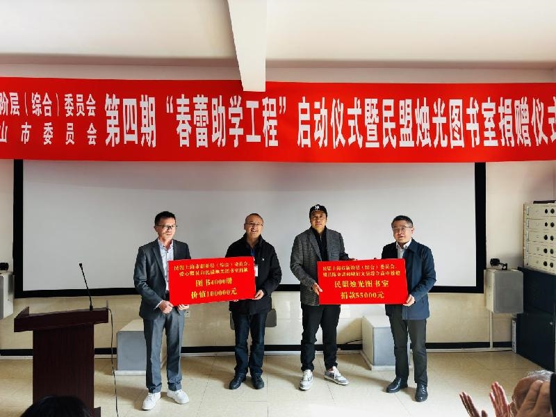 民盟烛光图书室捐赠仪式上,民盟上海市新阶层(综合)委员会、爱心盟员陈金恩向峨眉文旅综合高中捐赠民盟烛光图书室援建资金5.5万元,上海爱心盟员捐赠图书4000册价值10万元。