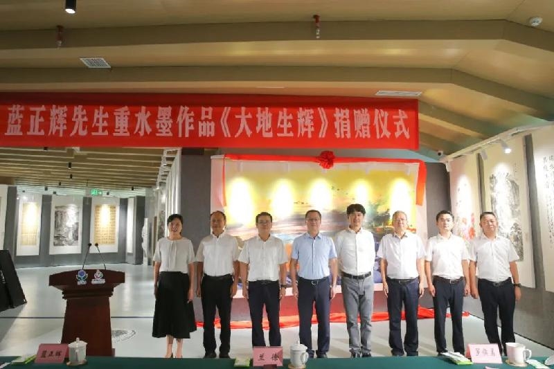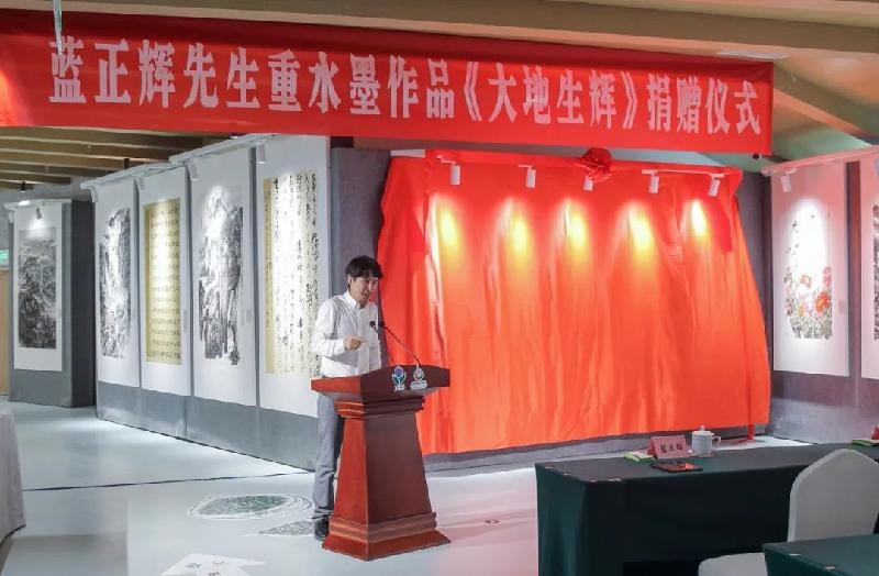 在捐赠仪式上,蓝正辉谈到威远的地貌在四川省的独特性。提出了“穹窿宝地,大地生辉”的概念,也是对这张巨作的诠释。另一方面也谈到文化艺术对地方经济的促进作用。威远县委书记兰徐代表威远县2023年世界无花果大会组委会向蓝正辉颁发收藏证书。