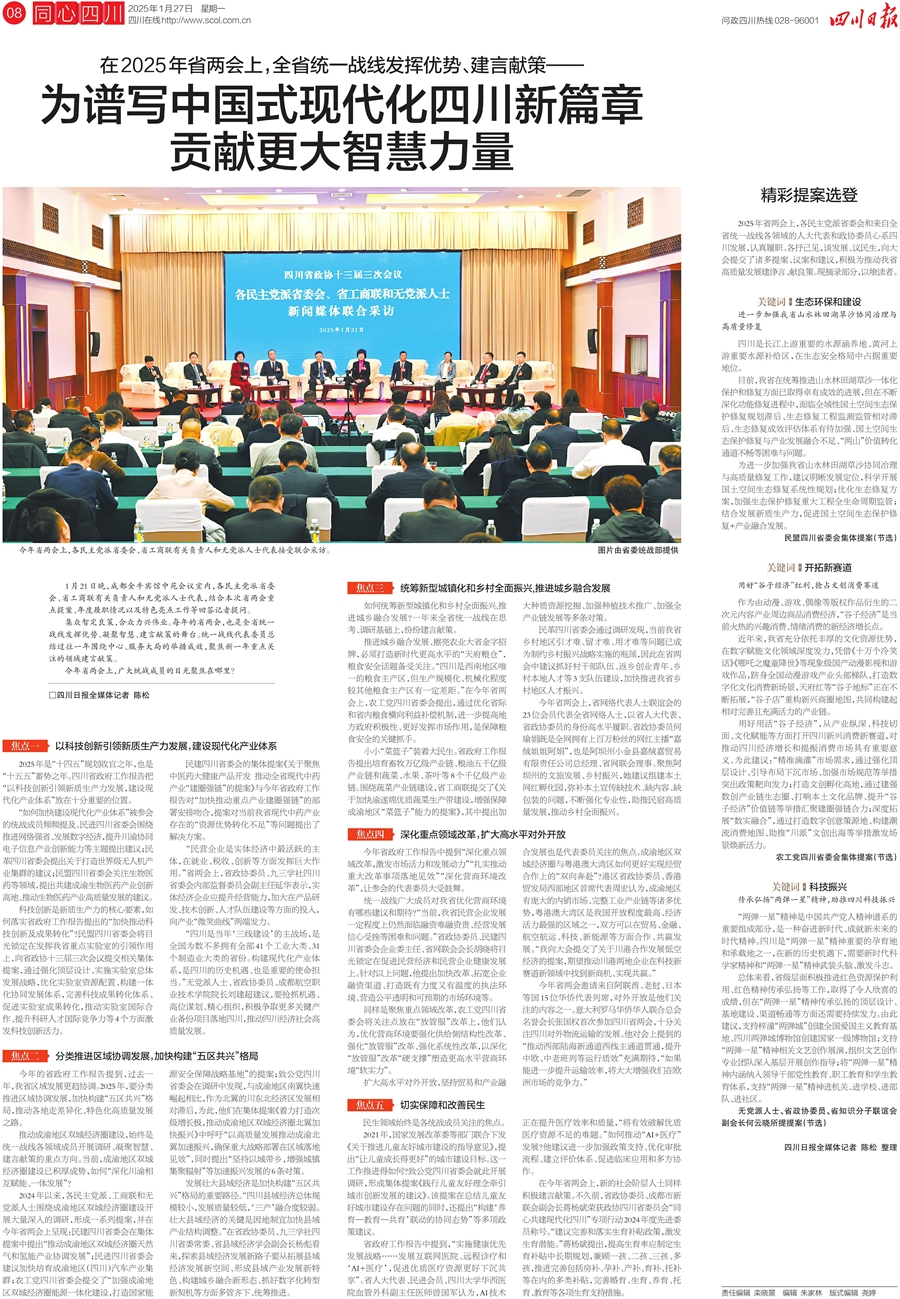 “如何加快建设现代化产业体系”被参会的统战成员频频提及。民进四川省委会围绕推进网络强省、发展数字经济,提升川渝协同电子信息产业创新能力等主题提出建议;民革四川省委会提出关于打造世界级无人机产业集群的建议;民盟四川省委会关注生物医药等领域,提出共建成渝生物医药产业创新高地、推动生物医药产业高质量发展的建议。