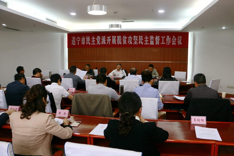 4月18日,遂宁市民主党派开展脱贫攻坚民主监督工作会议召开,学习贯彻全省脱贫攻坚工作情况通报会暨各民主党派开展脱贫攻坚民主监督工作座谈会和市委七届20次常委会议精神,深入贯彻中共遂宁市委关于脱贫攻坚民主监督重大决策部署。市委常委、市委统战部长杨军,民革市委主委、市政协副主席刘枫,民盟市委主委、市人大常委会副主任戴见明,民建市委主委、市政协副主席周通,民进市委主委、市政协副主席欧斯云,农工党市委主委、市政协副主席胡家正,无党派人士代表、市政协副主席谢炯出席会议。会议由市委统战部副部长李静波主持。