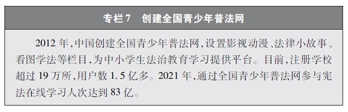 加强青少年网络法治宣传教育。青少年是祖国的未来、民族的希望。青少年网民在中国网民中的占比逐步增长。作为互联网的“原住民”,青少年是网上学习、交流、生活最活跃的参与者、实践者,其合法权益也更易受到网络违法活动的侵害。中国从保护青少年网络权益,促进青少年健康成长、全面发展出发,遵循青少年身心发展规律,贴近青少年学习生活实际,聚焦网络沉迷、网络欺凌、网络淫秽色情信息等重点问题,通过普法微综艺、儿童普法话剧、网络普法故事广播、网络普法云课堂、学法用法知识竞赛、法治副校长进校园、编写网络普法读本等生动活泼、丰富多彩的形式开展法治宣传教育,逐步形成了政府、社会、学校、家庭相结合的法治宣传教育格局,为提升青少年网民法治意识和网络安全素养提供了全面保障。