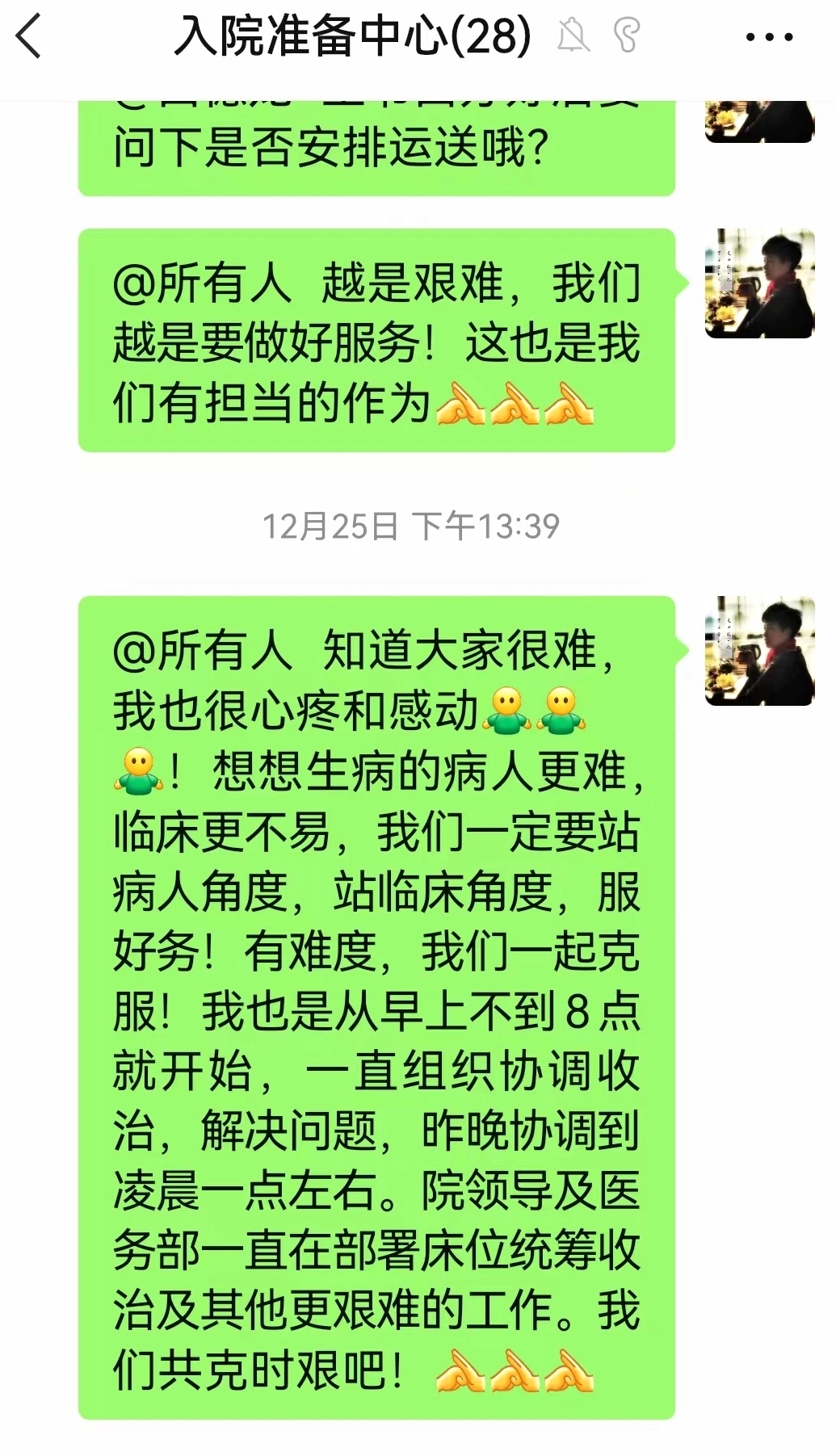 从本轮疫情之初,杨红前瞻性的完成入院团队培训与人才储备,带领团队到急诊抢救室和急诊观察室分流统筹安排有序收治患者。她说,“看到急诊里满满当当地全是等着收治或抢救的患者,凌晨排队就诊的队伍已排到大楼外,医务人员忙忙碌碌,一路小跑,声音嘶哑,第一批阳了还发着烧的的医务人员很快返岗,投入到各科的收治中。我们为临床一线保障患者生命安全而坚守忘我的精神所感动,暗下决心,不仅要把危重症者患者患者收治工作做好,同时,主动服务于临床,服务好临床,加强与各临床科室的沟通与交流,尽快把空出的床位用来收治患者,尽全力落实好医院部署的收治工作,保障患者的生命安全!”