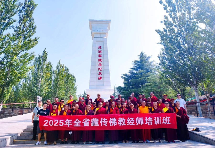 在林州红旗渠,通过参观纪念馆、纪念碑、分水闸和青年洞,经师们对“自力更生、艰苦创业、团结协助、无私奉献”的红旗渠精神有了深刻认识,进一步坚定了爱党爱国爱社会主义意识。幼时父母早逝,在党和国家的关怀下,才得以念完中学的新龙县俄普寺青年经师益西降措走出红旗渠纪念馆,不自觉地轻声哼唱起红歌《没有共产党就没有新中国》,并对带班干部说:“红旗渠精神与佛教教义中的核心概念‘利他’精神是完全相通的,都是为了世间黎民百姓。作为寺庙经师,一定要引领僧人做利益众生、贡献国家和社会的人。”