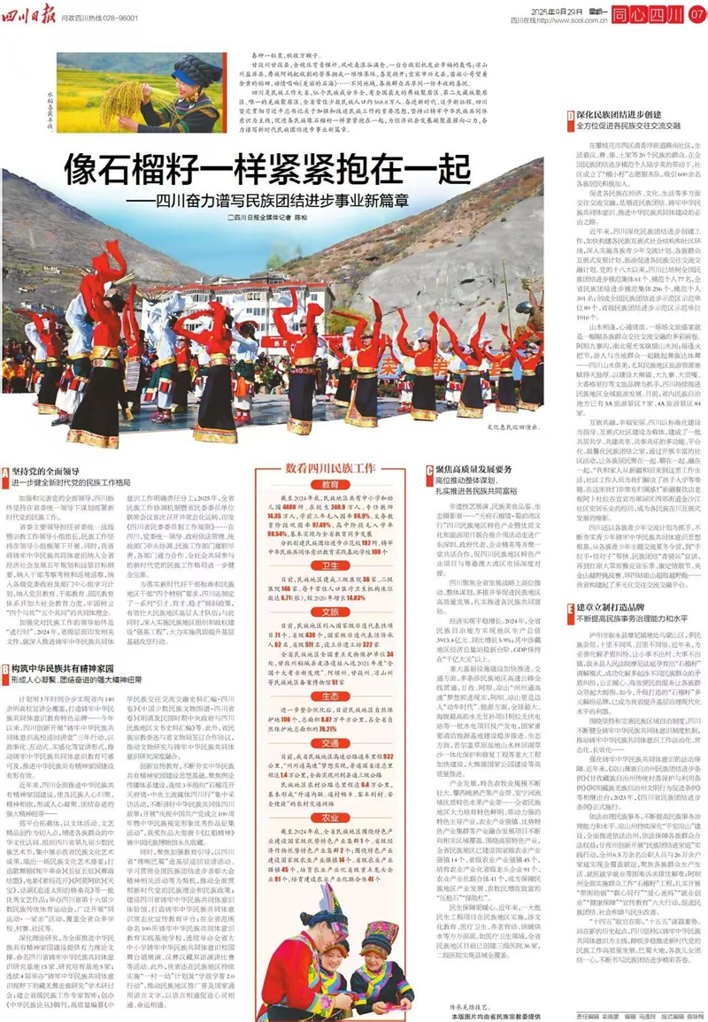 加强党对民族工作的领导始终是“进行时”。2024年,省级层面印发相关文件,就深入推进铸牢中华民族共同体意识工作明确责任分工;2025年,全省民族工作协调机制暨省民委委员单位联席会议首次召开并常态化运转,印发《四川省民委委员制工作规则》……在四川,党委统一领导、政府依法管理、统战部门牵头协调、民族工作部门履职尽责,各部门通力合作、全社会共同参与的新时代党的民族工作格局进一步健全完善。