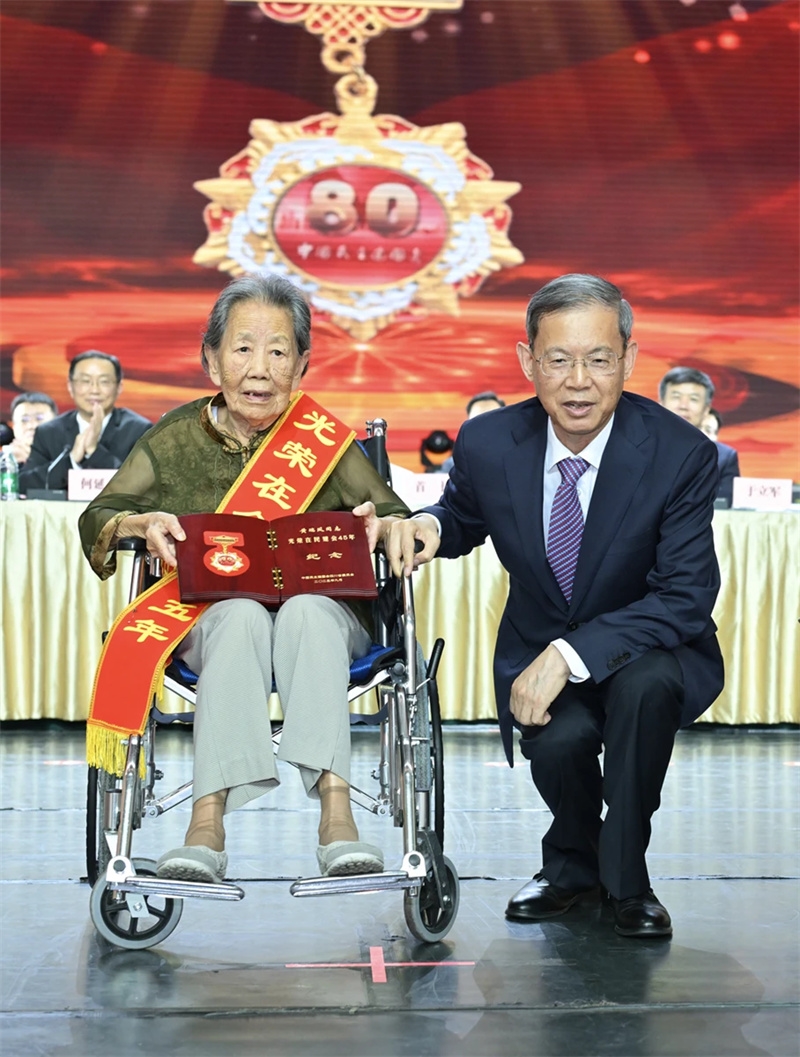 会上,郝明金为有着69年会龄的老会员代表黄瑞凤颁发“光荣在会45年”纪念章。