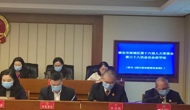 10月13日,雅安市雨城区第十六届人民代表大会常务委员会召开第三十八次会议,会前专题学习新修订的《四川省宗教事务条例》。雨城区民宗局负责人就《四川省宗教事务条例》的出台背景、重要意义、主要内容尤其是新修订的条款,以及如何贯彻落实宗教政策法规等作了深入细致的讲解。