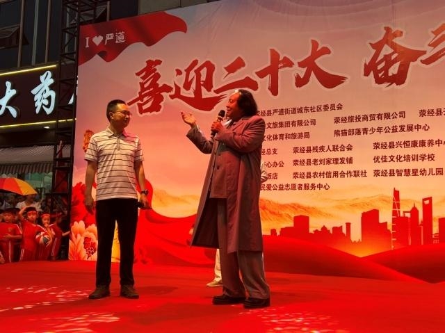 文艺演出在荥经县财富中心广场举行。尽管活动现场下着细雨,但随着民盟雅安市委老青妇工作委员会副主任、毛泽东特型演员郑万金的出场,完全点燃了观众的热情。台下观众高呼:“毛主席,我们最喜欢您啦!”郑万金扮演的毛主席与民盟荥经总支副主委陈钢在舞台上进行的一场穿越历史的对话,宣传了民盟在党的领导下对西南片区解放作出的历史贡献,让群众了解了统一战线在革命战争中的作用。