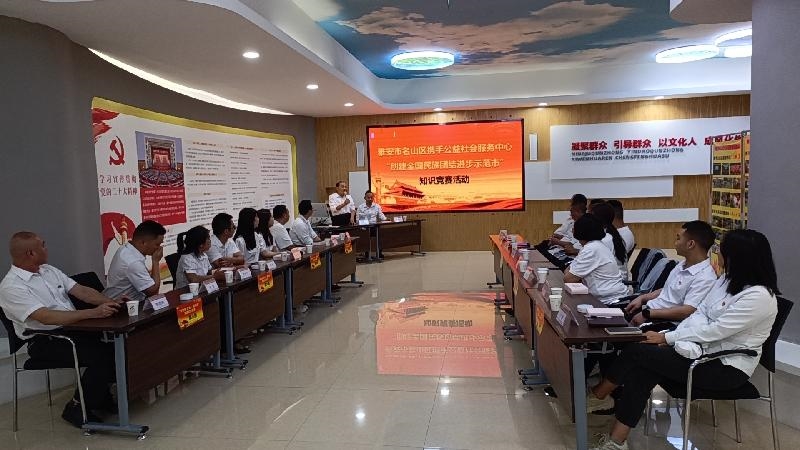 6月17日下午,雅安市名山区携手公益社会服务中心为认真学习宣传党的二十大精神和中央、省委、市委民族工作会议精神,广泛深入开展铸牢中华民族共同体意识宣传教育,联合雅安市名山区民生社会服务中心、雅安市名山区亲民城乡综合服务中心,在雅安市名山区党群服务中心红色大厅开展“创建全国民族团结进步示范市”知识竞赛活动。