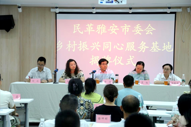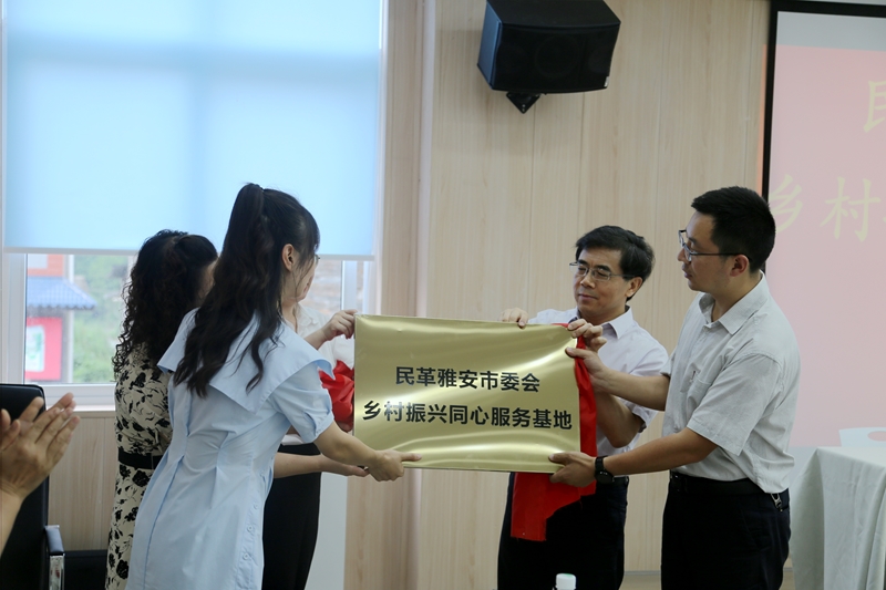 7月11日,民革雅安市委会在雅安市云台山茶文化学院举行乡村振兴同心服务基地揭牌仪式。民革雅安市委会主委、市政协副主席李诚,雨城区乡村振兴局局长汪轶玮一同为民革雅安市委会乡村振兴同心服务基地揭牌,民革雅安市委会专职副主委、市政协副秘书长吴虹主持揭牌仪式,雅安市乡村振兴局郑晓梅科长、雨城区草坝镇党委副书记刘达及市、区民革党员代表、草坝镇村组负责人、茶企、茶农代表共计60人共同见证揭牌仪式。