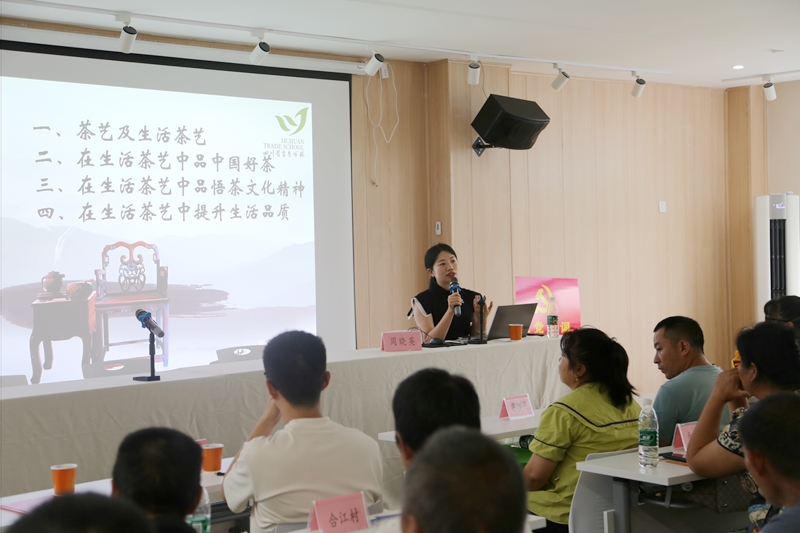 揭牌仪式结束后,周晓英、郭磊分别作题为《在生活茶艺中修身养性》《茶叶感官审评基础知识》的授课,受到参会村组干部、茶企代表、种茶大户的一致好评。