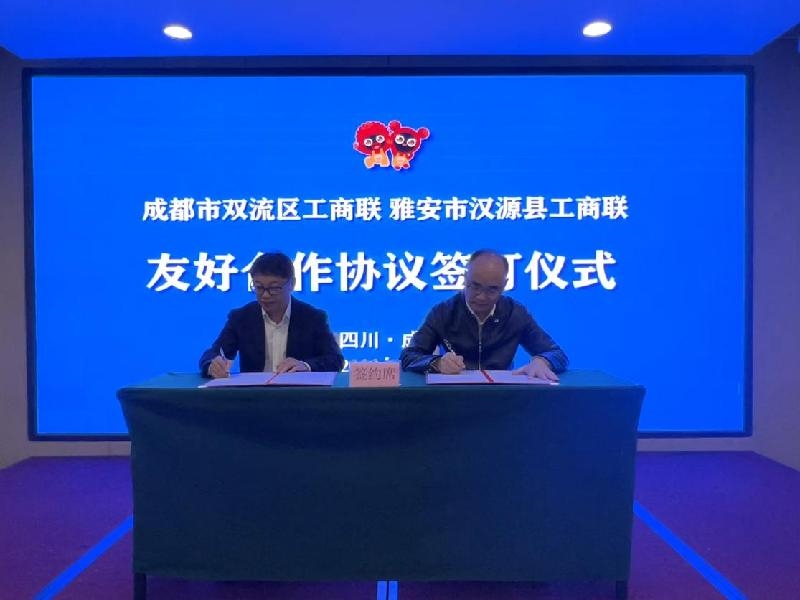 成都市双流区工商联党组成员、秘书长银建与汉源县委统战部常务副部长、县工商联党组书记薛朝军签订友好合作协议。