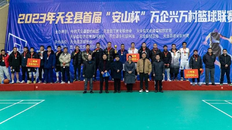 1月11日,为期近一个月的天全县首届“安山杯”万企兴万村篮球联赛,随着裁判员的终场哨响,在县体育馆圆满收官。天全县“万企兴万村”行动领导小组成员单位负责人及县文化旅游和体育局相关负责人出席闭幕式并颁奖。