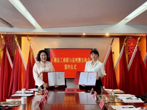 活动伊始,昆明雅安商会会长徐世芬致欢迎词,她围绕商会基本情况以及商会在招商引资、返乡投资等方面工作进行了介绍。石棉县投资促进服务中心相关负责人围绕石棉县的产业规划布局、营商环境、政策支持等方面开展了招商引资推介,双方就石棉县目前重点招商项目进行交流发言,并表示希望能在能源板块、矿山修复等项目上寻求更多合作机会。随后,石棉县工商联和昆明雅安商会签订商会友好合作协议,为未来双方的互利合作奠定了坚实基础。