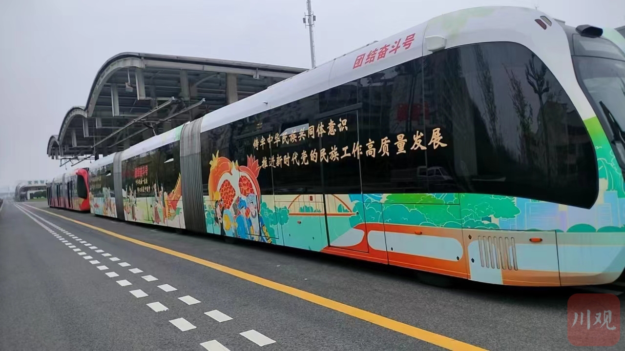 据介绍,这辆别具特色的“团结奋斗号”智轨列车由宜宾市民宗局和蜀道集团下属的智轨集团公司共同打造,将持续运行五个月,目的是营造宜宾民族团结进步浓厚氛围。