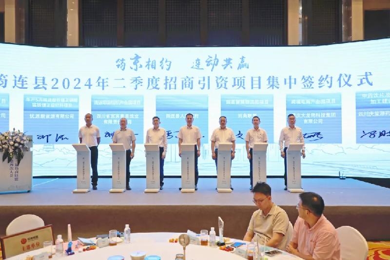 在筠连县 2024 年第二季度招商引资集中签约仪式环节,副县长李建杰介绍了筠连县经济社会发展情况并进行了招商引资推介,现场发布民间投资机会清单,随后进行了6个投资项目的集中签约。