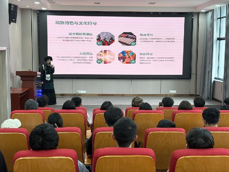 活动以“我的家乡”为主题,借助PPT、短视频和实物展示等多元形式,全方位展现了我国各民族深厚的历史积淀与独特的文化风貌。在民族风情展示环节,大学生讲解员以生动解说配合影像资料,将彝族传统节日“火把节”“彝族年”的盛况娓娓道来,带领观众沉浸式体验了彝族同胞的节日文化。活动现场展示的精美银饰和手工刺绣服饰,更是吸引众人目光,让观众近距离感受到中华文化“各美其美,美美与共”的绚丽篇章。