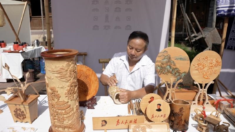 “你看,轻轻一捏,这里就是小兔子的耳朵了!”在宜宾面塑的摊位前,来自上海的游客陈女士在非遗传承人赖维君的指导下,小心翼翼地为手中的面塑玉兔点睛。不远处,国家级非遗江安竹簧玉竹派的第五代传承人周波正凝神屏息,手中的刻刀在薄薄的竹簧上游走,发出细微的“沙沙”声。寥寥数刀,雕刻出意境深远的山水画卷。他向来往的游客介绍:“竹刻考验的是耐心与匠心,简单的几天,复杂的则需要数月。老祖宗的手艺,需要我们一代代这样‘刻’下去。”