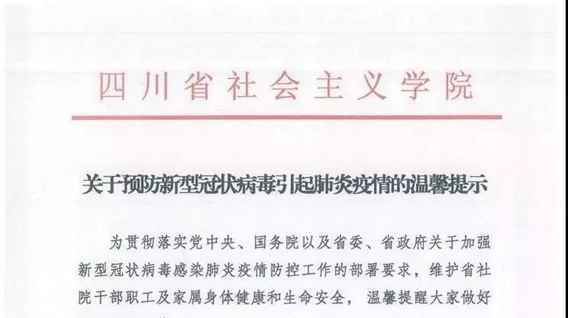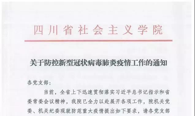 疫情就是命令,防控就是责任。新型冠状病毒感染的肺炎疫情爆发以来,四川省社会主义学院深入学习贯彻习近平总书记有关重要讲话和重要指示精神,认真贯彻落实中央和省委部署要求,细化措施,全面排查,强化监管,全力以赴做好疫情防控各项工作,积极努力为打赢疫情防控阻击战作贡献。