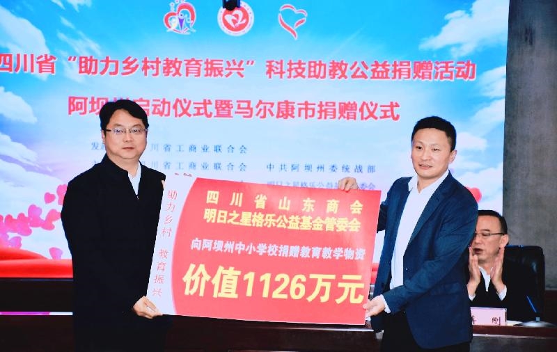 4月11日,州委统战部、州工商联联合四川省山东商会、明日之星格乐公益基金管委会在马尔康市组织四川省“助力乡村教育振兴”科技助教公益捐赠活动,向阿坝州教育局捐赠价值1126万元的教育数字化设备。州委常委、统战部部长冯宇出席仪式并讲话,马尔康市委副书记、市长蒋刚致辞。州委宣传部、州委统战部、州教育局、州工商联、马尔康市委统战部、市教育局、市工商联以及马尔康市15所受捐助学校负责同志参加活动。