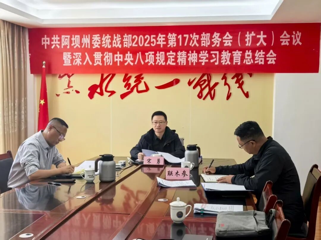9月16日,州委统战部召开部务会(扩大)会议暨深入贯彻中央八项规定精神学习教育总结会议,传达学习习近平总书记关于深入贯彻中央八项规定精神学习教育的重要指示精神及中央、省委、州委总结会议精神,总结部机关学习教育情况,研究部署巩固拓展学习教育成果、推进作风建设常态化长效化有关工作。州委常委、统战部部长宋勇主持会议并讲话。